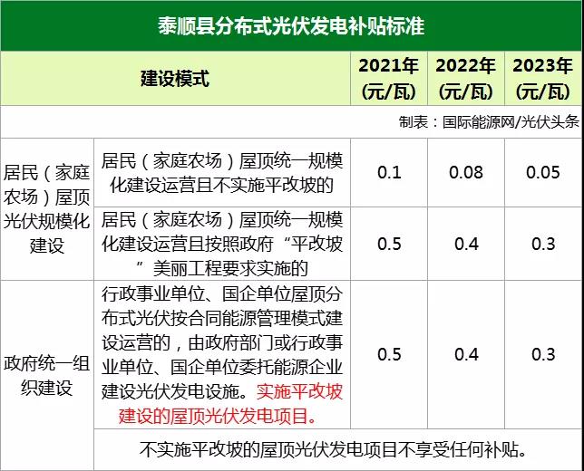 居民(家庭農(nóng)場)屋頂光伏規(guī)?;ㄔO。居民(家庭農(nóng)場)屋頂統(tǒng)一規(guī)?;ㄔO運營且不實施平改坡的,在光伏發(fā)電項目建成、并網(wǎng)和驗收后給予居民發(fā)放一次性建設補貼。2021年、2022年、2023年建成、并網(wǎng)和驗收的實行差異化補貼,補貼標準分別為0.1元/瓦、0.08元/瓦、0.05元/瓦;