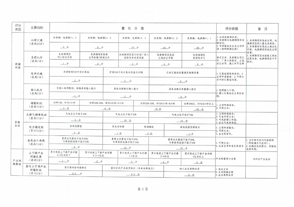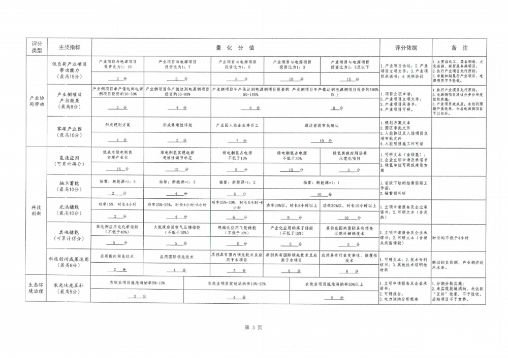 根據(jù)文件,其評(píng)分內(nèi)容主要包括企業(yè)投資能力、項(xiàng)目前期深度、荷儲(chǔ)網(wǎng)源、多能互補(bǔ)、產(chǎn)業(yè)協(xié)同帶動(dòng)、生態(tài)治理以及地方經(jīng)濟(jì)貢獻(xiàn)等八大類,各類項(xiàng)目下面細(xì)小劃分35個(gè)小項(xiàng)。不同類別之間設(shè)置不同分值,以總得分計(jì)算排序。