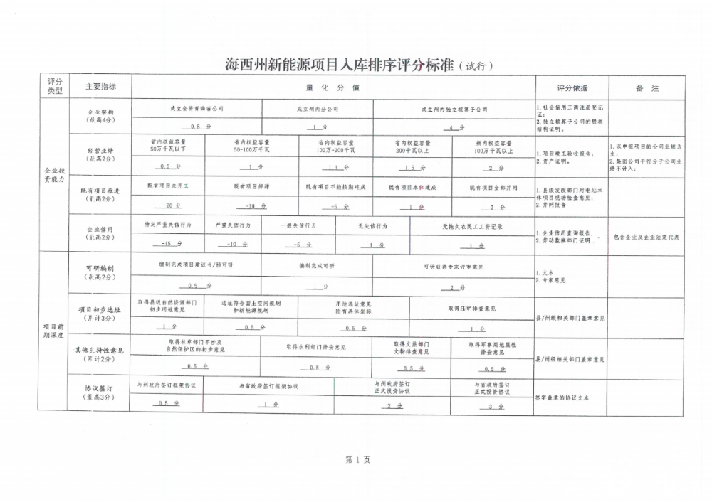 1月19日,青海海西州發(fā)改委印發(fā)《新能源項(xiàng)目入庫排序評(píng)分標(biāo)準(zhǔn)》,通過八大類35小項(xiàng)的評(píng)分類型對(duì)新能源項(xiàng)目進(jìn)行評(píng)分排序。