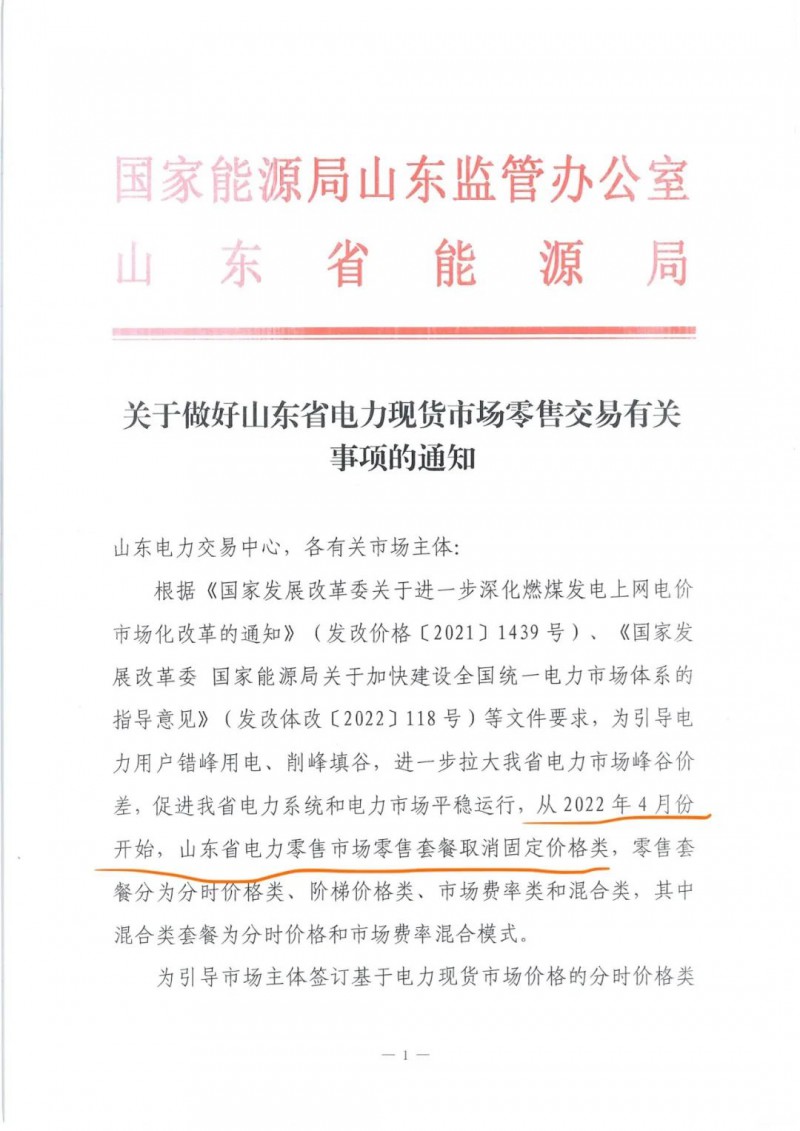 在此次交易公告發(fā)布之前,本月另一份文件的印發(fā)也相當(dāng)重要:3月7日,山東政府發(fā)布《關(guān)于做好山東省電力現(xiàn)貨市場(chǎng)零售交易有關(guān)事項(xiàng)的通知》,宣布從4月起,山東零售市場(chǎng)取消固定費(fèi)率套餐,引導(dǎo)市場(chǎng)主體簽訂基于山東現(xiàn)貨市場(chǎng)價(jià)格的分時(shí)價(jià)格類(lèi)套餐。(下圖)
