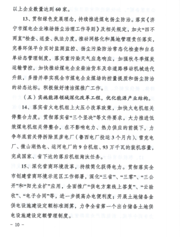 持續(xù)提升新能源和可再生能源開發(fā)利用規(guī)模。落實市政府《關(guān)于加快新能源和可再生能源高質(zhì)量發(fā)展意見》,統(tǒng)籌優(yōu)化新能源開發(fā)布局,提質(zhì)升級發(fā)展“光伏+”工程,穩(wěn)步有序發(fā)展生物質(zhì)能,打造新能源多元化利用示范基地。一是突出抓好華能嘉祥梁寶寺150兆瓦“農(nóng)光互補”項目(一期)等8個納入電網(wǎng)接入和消納意見的新能源項目建設(shè),積極推進嘉祥、梁山、魚臺、鄒城和曲阜整縣分布式光伏規(guī)?;_發(fā)試點工作。全力支持時代永福濟寧漁光互補項目和山能集團在濟寧分布式光伏項目建設(shè)。二是大力發(fā)展智慧能源,積極推進泗水海螺工業(yè)園區(qū)“零購電”源網(wǎng)荷儲一體化智慧示范園區(qū)和魯抗鄒城園區(qū)綠色能源示范項目建設(shè)。三是探索發(fā)展儲能產(chǎn)業(yè),在用戶側(cè)、電源側(cè)和電網(wǎng)側(cè)分類推進儲能示范工程建設(shè),力爭2022年建成11萬千瓦左右的儲能設(shè)施。