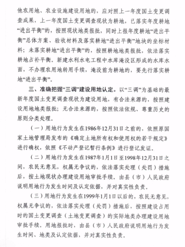 3月9日,自然資源部辦公廳印發(fā)《關(guān)于以"三調(diào)"成果為基礎(chǔ)做好建設用地審查報批地類認定的通知》,自4月15日起實施?!锻ㄖ访鞔_了建設用地審查報批時地類認定規(guī)則。對報批時現(xiàn)狀為建設用地的,應根據(jù)其來源合法性進行分類處理。有合法來源的,按照建設用地地類報批;無合法來源的,按照建設占用時的國土變更調(diào)查(土地變更調(diào)查)的實際地類報批,地類為耕地的,應依法落實耕地占補平衡。