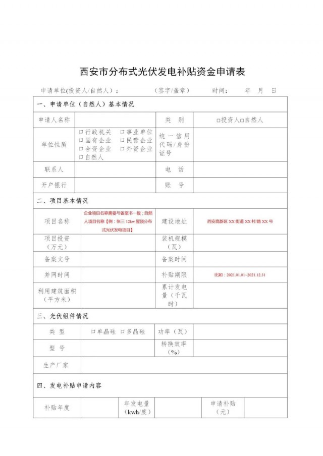 (一)西安市分布式光伏發(fā)電補(bǔ)貼資金申請表(見附件1);