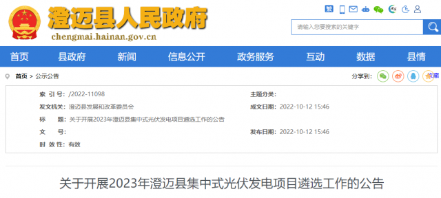 10月12日,海南澄邁縣政府網(wǎng)發(fā)布“關(guān)于開展2023年澄邁縣集中式光伏發(fā)電項目遴選工作的公告”。
