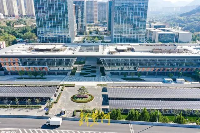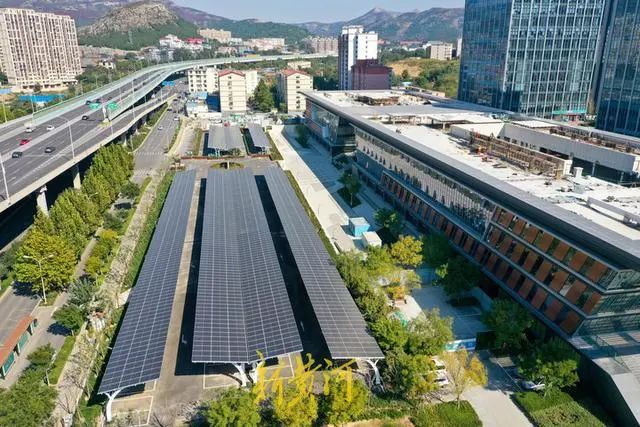 10月19日,濟(jì)南市中區(qū)山東大學(xué)國(guó)家大學(xué)科技園的露天停車(chē)場(chǎng)新加裝了光伏車(chē)棚,光伏停車(chē)場(chǎng)在高空俯瞰之下格外壯觀。