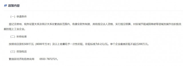 10月31日,安徽省蕪湖市繁昌區(qū)發(fā)布《建設分布式光伏發(fā)電項目并用于工業(yè)企業(yè)生產(chǎn)綠色技改獎補政策》,對“登記注冊地、稅務征管關系及統(tǒng)計關系在繁昌區(qū)范圍內(nèi),有健全財務制度、具有獨立法人資格、實行獨立核算,對區(qū)域節(jié)能減排降碳等領域發(fā)展作出積極貢獻的規(guī)上工業(yè)企業(yè)”進行政策獎補。