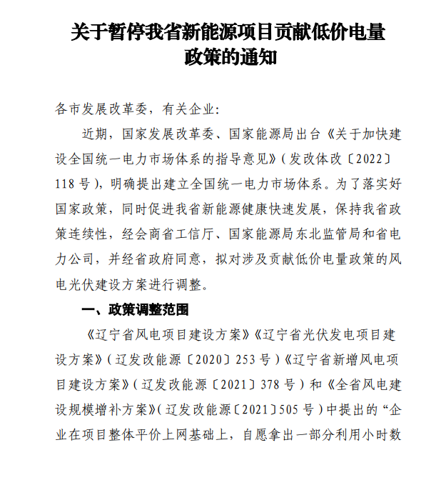 11月28日,遼寧省發(fā)改委發(fā)布通知,對《關(guān)于暫停我省新能源項目貢獻(xiàn)低價電量政策的通知》征求意見。