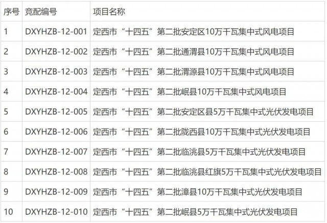 12月9日,甘肅省定西市發(fā)改委發(fā)布《定西市“十四五”第二批風光電項目競爭性配置公告》,本次競爭性配置的總規(guī)模80萬千瓦,共有4個風電項目(合計40萬千瓦)、6個光伏發(fā)電項目(合計40萬千瓦)同時競配。