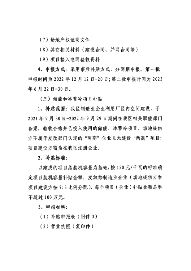 為進(jìn)一步貫徹落實(shí)中央、省關(guān)于振興實(shí)體經(jīng)濟(jì)和市“產(chǎn)業(yè)第一、制造業(yè)優(yōu)先”的決策部署,鼓勵(lì)企業(yè)建設(shè)光伏發(fā)電、儲(chǔ)能和冰蓄冷項(xiàng)目,支持制造業(yè)發(fā)展,有力有序有效做好碳達(dá)峰、碳中和工作,根據(jù)《關(guān)于印發(fā)〈肇慶高新區(qū)節(jié)約用電支持制造業(yè)發(fā)展補(bǔ)貼資金申報(bào)指南〉的通知》(以下簡(jiǎn)稱《指南》)等有關(guān)規(guī)定,結(jié)合我區(qū)實(shí)際,現(xiàn)就申報(bào)光伏發(fā)電、儲(chǔ)能和冰蓄冷項(xiàng)目補(bǔ)貼有關(guān)事項(xiàng)進(jìn)一步明確如下: