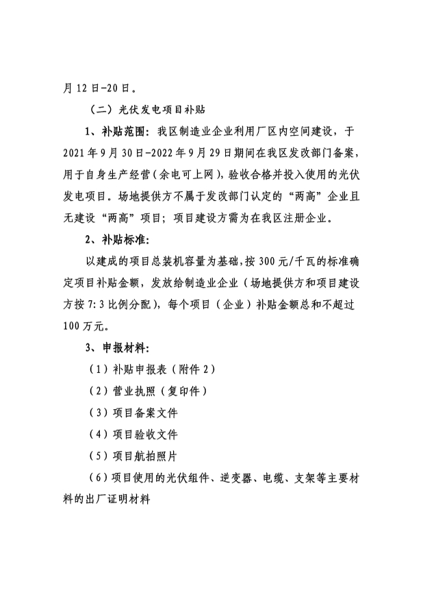 12月10日,廣東省肇慶高新區(qū)發(fā)展規(guī)劃和國(guó)土資源局、肇慶高新區(qū)經(jīng)濟(jì)貿(mào)易和科技局發(fā)布《關(guān)于進(jìn)一步明確申報(bào)光伏發(fā)電、儲(chǔ)能和冰蓄冷項(xiàng)目補(bǔ)貼有關(guān)事項(xiàng)的通知》,《通知》中提到:我區(qū)制造業(yè)企業(yè)利用廠區(qū)內(nèi)空間建設(shè),于2021年9月30日-2022年9月29日期間在我區(qū)發(fā)改部門備案,用于自身生產(chǎn)經(jīng)營(yíng)(余電可上網(wǎng)),驗(yàn)收合格并投入使用的光伏發(fā)電項(xiàng)目。
