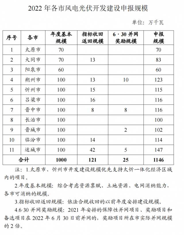 《通知》稱,工作目標(biāo)為,安排風(fēng)電、光伏保障性并網(wǎng)年度規(guī)模1000萬(wàn)千瓦,獎(jiǎng)勵(lì)規(guī)模146萬(wàn)千瓦。根據(jù)該通知,2022年呂梁市年度風(fēng)、光規(guī)模共計(jì)116萬(wàn)千瓦。