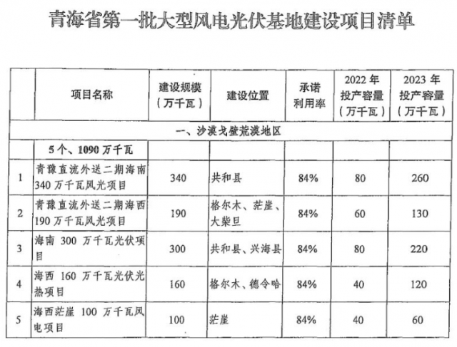 第一批以沙漠、荒漠、戈壁地區(qū)為重點(diǎn)的大型風(fēng)電光伏基地建設(shè)項(xiàng)目清單總計9705萬千瓦。風(fēng)光規(guī)模4:6,目前已全面開工建設(shè)。其中沙漠、戈壁、荒漠地區(qū)容量約為4300萬千瓦。青海涉及5個共計1090萬千瓦。