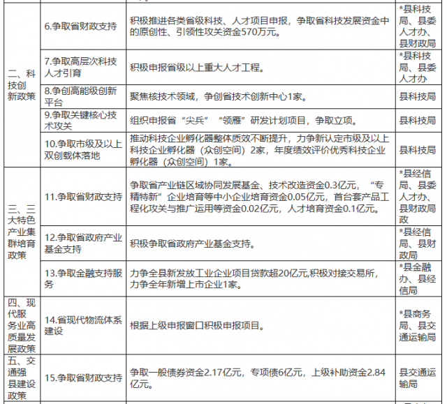 上述8個領(lǐng)域政策縣財政2023年預(yù)算安排資金,除交叉重疊部分外,支持總額約50億元。各領(lǐng)域政策縣級牽頭單位要根據(jù)文件要求,會同財政金融、自然資源、能源、人才等要素保障單位,抓緊出臺配套政策文件,及時做好政策的宣傳解讀、責(zé)任分解和落地實施,推動政策精準(zhǔn)滴灌、直達(dá)快享,確保基層有感、群眾獲益、企業(yè)得利。