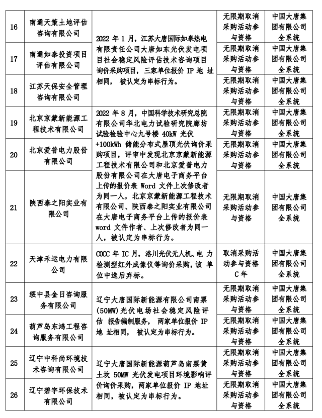 3月1日,大唐集團發(fā)布2023年第2批關(guān)于供應(yīng)商不良行為處理情況的公告,共有699家企業(yè)被點名。其中,包含12個光伏項目招標(biāo)相關(guān)的26家供應(yīng)商被點名。