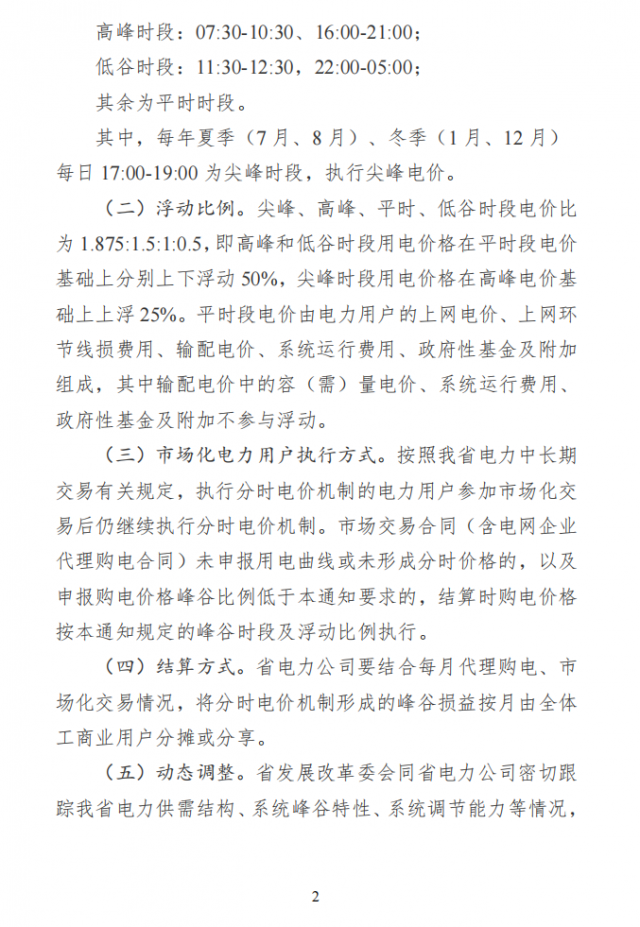 高峰時段:07:30-10:30、16:00-21:00;低谷時段:11:30-12:30,22:00-05:00;其余為平時時段。其中,每年夏季(7月、8月)、冬季(1月、12月)每日17:00-19:00為尖峰時段,執(zhí)行尖峰電價。