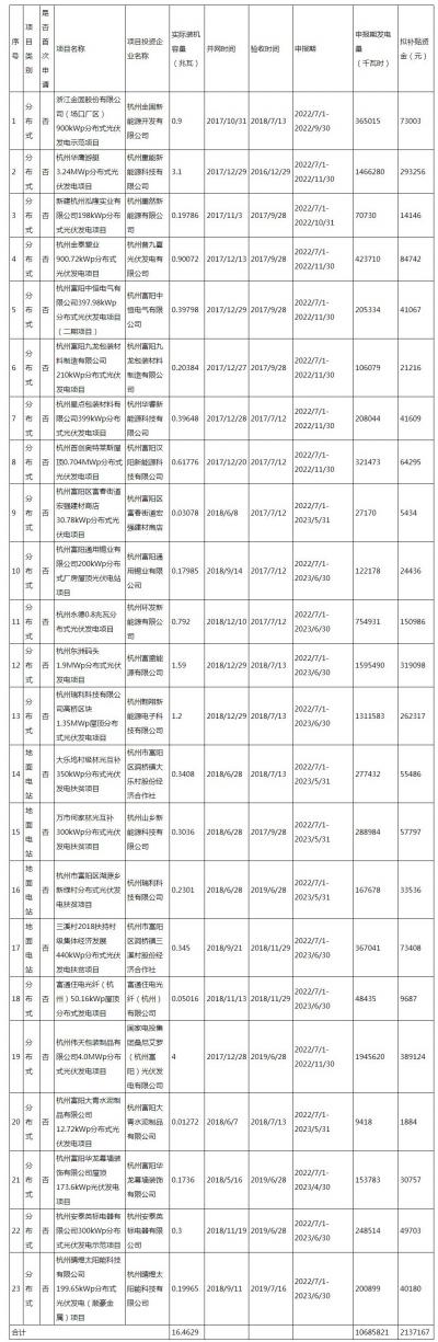 根據(jù)區(qū)經(jīng)濟(jì)和信息化局、區(qū)財(cái)政局《關(guān)于太陽(yáng)能光伏發(fā)電資助的實(shí)施細(xì)則》(富經(jīng)信財(cái)〔2018〕10號(hào),富財(cái)企〔2018〕428號(hào)),《杭州市富陽(yáng)區(qū)人民政府關(guān)于深入實(shí)施高新工業(yè)強(qiáng)區(qū)戰(zhàn)略的若干意見(jiàn)(試行)》(富政〔2018〕4號(hào))及區(qū)政府文件處理單2020年第501號(hào)之規(guī)定,我區(qū)組織開(kāi)展2023年富陽(yáng)區(qū)非居民光伏發(fā)電項(xiàng)目區(qū)級(jí)補(bǔ)貼兌現(xiàn)工作。經(jīng)區(qū)經(jīng)信局會(huì)同區(qū)財(cái)政局、區(qū)供電公司等相關(guān)部門(mén)審核,我區(qū)23家企業(yè)的23個(gè)項(xiàng)目符合補(bǔ)貼條件,擬補(bǔ)貼資金2137167元,詳見(jiàn)附表?,F(xiàn)予以公示,歡迎社會(huì)各界進(jìn)行監(jiān)督。