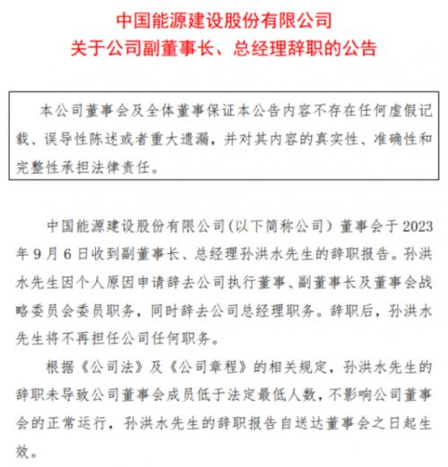2023年9月6日,中國(guó)能建公告,孫洪水辭職,將不再擔(dān)任公司任何職務(wù)。