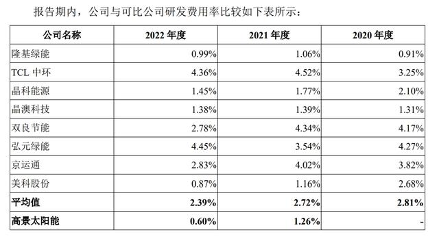 但高景太陽(yáng)能與同行相比,研發(fā)投入占營(yíng)收比例較低。招股書數(shù)據(jù)顯示,2020年,高景太陽(yáng)能未發(fā)生研發(fā)費(fèi)用。2021-2022年,高景太陽(yáng)能研發(fā)費(fèi)用分別約3143.15萬(wàn)元、1.06億元,占當(dāng)期營(yíng)收比重僅為1.26%和0.6%。作為光伏產(chǎn)業(yè)鏈企業(yè),研發(fā)費(fèi)用過(guò)低或?qū)⒂绊懝竞罄m(xù)經(jīng)營(yíng)潛力。
