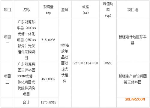 本次組件采購包括廣東能源莎車縣2000MW光儲一體化項目(550MW部分)光伏組件采購項目、廣東能源兵團(tuán)三師45團(tuán)350MW光儲一體化項目光伏組件采購項目的單晶雙面雙玻太陽能光伏組件及配套組串引出線用接插件、備品備件、專用工具和技術(shù)服務(wù),具體數(shù)量及要求如下: