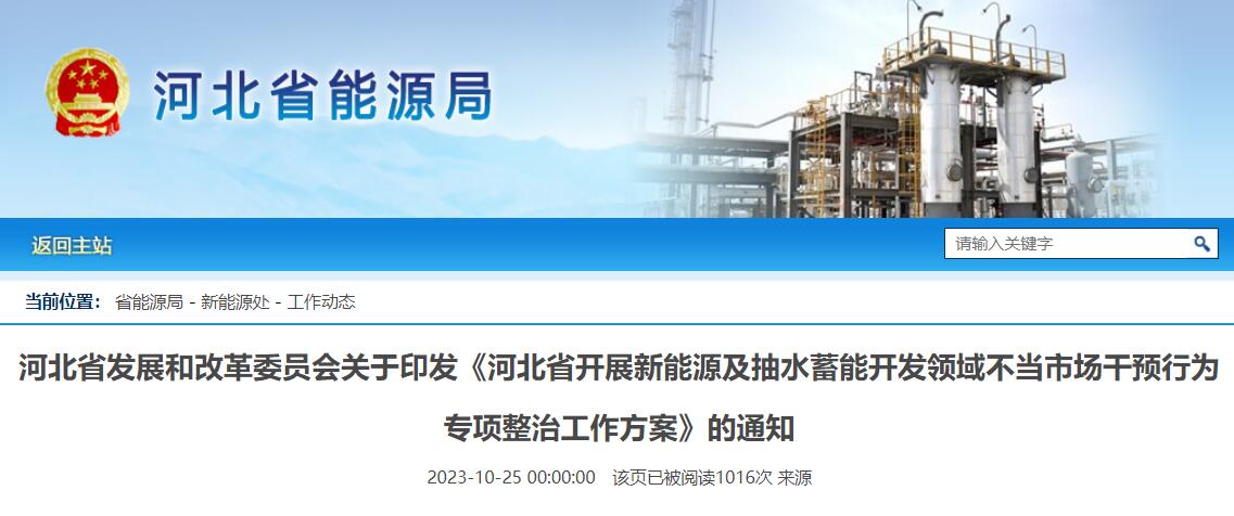 10月25日,河北省發(fā)展和改革委員會(huì)發(fā)布關(guān)于印發(fā)《河北省開展新能源及抽水蓄能開發(fā)領(lǐng)域不當(dāng)市場(chǎng)干預(yù)行為專項(xiàng)整治工作方案》(以下簡(jiǎn)稱《方案》)的通知。