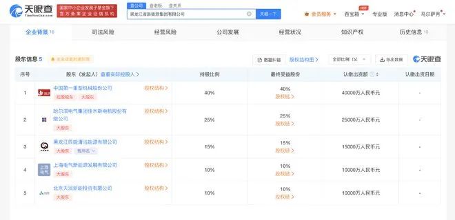 天眼查App顯示,11月20日,黑龍江省新能源集團有限公司成立,法定代表人為劉軼,注冊資本10億人民幣,經(jīng)營范圍含新興能源技術(shù)研發(fā)、風(fēng)電場相關(guān)系統(tǒng)研發(fā)、以自有資金從事投資活動、風(fēng)力發(fā)電技術(shù)服務(wù)、太陽能發(fā)電技術(shù)服務(wù)、儲能技術(shù)服務(wù)、工程管理服務(wù)等。股東信息顯示,該公司由中國一重(601106)、佳電股份(000922)、黑龍江辰能清潔能源有限公司、上海電氣新能源發(fā)展有限公司、北京天潤新能投資有限公司共同持股。