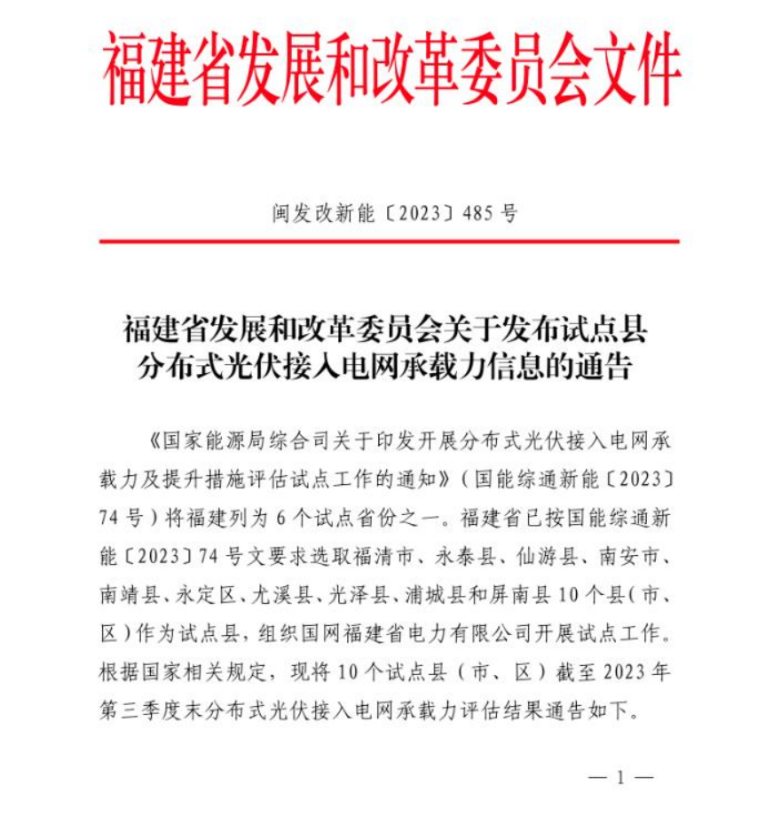《通告》稱,《國家能源局綜合司關(guān)于印發(fā)開展分布式光伏接入電網(wǎng)承載力及提升措施評估試點工作的通知》(國能綜通新能〔2023〕74號)將福建列為6個試點省份之一。按照國能綜通新能〔2023〕74號文要求,福建省選取福清市、永泰縣、仙游縣、南安市、南靖縣、永定區(qū)、尤溪縣、光澤縣、浦城縣和屏南縣10個縣(市、區(qū))作為試點縣,組織國網(wǎng)福建省電力有限公司開展試點工作。