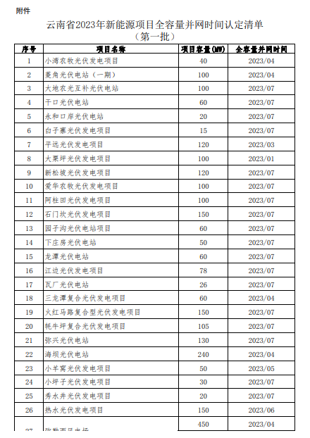 根據(jù)《云南省發(fā)展和改革委員會(huì) 云南省能源局關(guān)于云南省光伏發(fā)電上網(wǎng)電價(jià)政策有關(guān)事項(xiàng)的通知》(云發(fā)改價(jià)格〔2023〕319號(hào))以及《云南省發(fā)展和改革委員會(huì) 云南省能源局關(guān)于進(jìn)一步完善風(fēng)電上網(wǎng)電價(jià)政策有關(guān)事項(xiàng)的通知》(云發(fā)改價(jià)格〔2023〕665號(hào))文件精神,新能源全容量并網(wǎng)時(shí)間的認(rèn)定由省能源局會(huì)同云南電網(wǎng)公司負(fù)責(zé)。為加強(qiáng)社會(huì)監(jiān)督,廣泛征求意見,現(xiàn)將經(jīng)認(rèn)定后的項(xiàng)目清單予以公示,有關(guān)情況如下: