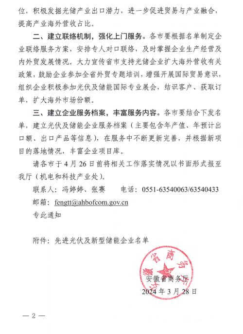文件要求,各市要根據(jù)名單制定企業(yè)聯(lián)絡(luò)服務(wù)方案,安排專人對(duì)口聯(lián)絡(luò),及時(shí)掌握企業(yè)生產(chǎn)經(jīng)營(yíng)及內(nèi)外貿(mào)發(fā)展情況。大力宣傳省市支持光儲(chǔ)企業(yè)擴(kuò)大海外營(yíng)收有關(guān)政策,鼓勵(lì)企業(yè)參加全省外貿(mào)專題培訓(xùn),增強(qiáng)開展國(guó)際貿(mào)易意識(shí)組織企業(yè)積極參加光伏及儲(chǔ)能國(guó)際專業(yè)展會(huì),結(jié)識(shí)客戶、獲取訂單,擴(kuò)大海外市場(chǎng)份額。