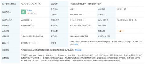 企查查顯示,4月17日,中電建(內(nèi)蒙古扎魯特)抽水蓄能有限公司成立,法定代表人為劉玉含,注冊(cè)資本3000萬人民幣,經(jīng)營范圍含風(fēng)力發(fā)電技術(shù)服務(wù)、太陽能發(fā)電技術(shù)服務(wù)、新興能源技術(shù)研發(fā)、電力行業(yè)高效節(jié)能技術(shù)研發(fā)等。