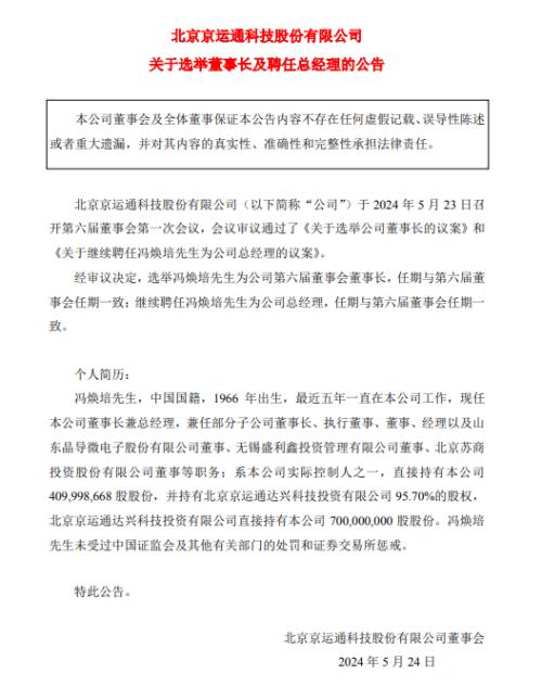 馮煥培繼續(xù)擔(dān)任京運(yùn)通董事長(zhǎng)、總經(jīng)理!