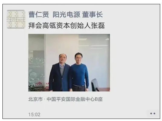 值得一提的是,在陽光電源發(fā)布定增預案之前的1月26日,陽光電源董事長曹仁賢的朋友圈里就發(fā)布了一張與張磊的合照,并配文“拜會高瓴資本創(chuàng)始人高磊”。這不僅引人遐想,高瓴會像入股隆基一樣,入股陽光電源么??