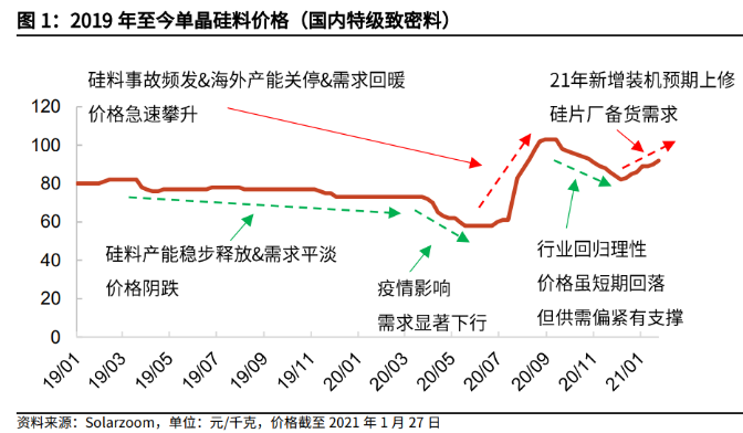 在硅料景氣度高漲的背景下,部分投資者擔(dān)心技術(shù)的更新迭代(顆粒硅技術(shù))將給硅料生產(chǎn)龍頭公司未來(lái)的發(fā)展前景帶來(lái)不確定性,但是我們認(rèn)為,當(dāng)前硅料環(huán)節(jié)的主要矛盾是2021年供需形式緊張(供不應(yīng)求)帶來(lái)的硅料供應(yīng)階段性緊缺,這也將推動(dòng)硅料價(jià)格維持高位,甚至在特定時(shí)間或特殊因素催化下突破100元/千克的高位,從而保障硅料龍頭企業(yè)(通威股份、新特能源、東方希望、大全新能源等)2021年的業(yè)績(jī)?cè)鲩L(zhǎng)和盈利能力維持;技術(shù)更新迭代則是當(dāng)前時(shí)點(diǎn)的次要矛盾,F(xiàn)BR顆粒硅技術(shù)的確有望成為下一代光伏的硅料技術(shù),但是目前顆粒硅的產(chǎn)能、下游使用占比仍相對(duì)較低,需持續(xù)關(guān)注保利協(xié)鑫2021年6月底顆粒硅產(chǎn)能擴(kuò)產(chǎn)至3萬(wàn)噸后顆粒硅品質(zhì)的提升、下游硅片廠商應(yīng)用、以及成本的降低情況。(文章來(lái)源:光大證券)