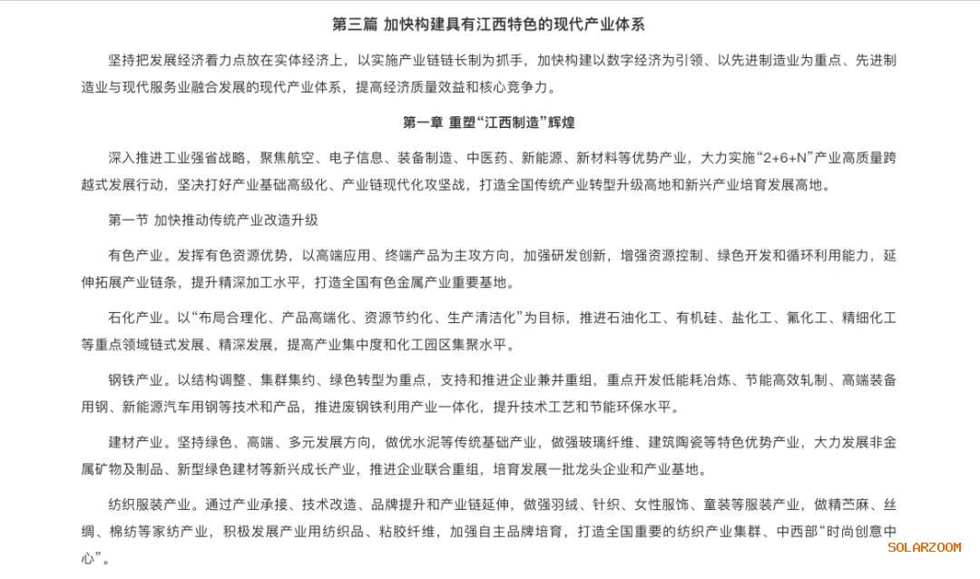 除發(fā)電端外,江西省在“十四五”期間,將加快新一代太陽能電池、新型鋰離子動(dòng)力電池產(chǎn)業(yè)化,推廣“光伏+”應(yīng)用,提高光伏轉(zhuǎn)化效率,大力發(fā)展鋰電電池關(guān)鍵材料,培育若干國際一流企業(yè),打造全國新能源產(chǎn)業(yè)重要基地,建設(shè)世界級新能源產(chǎn)業(yè)集聚區(qū)。
