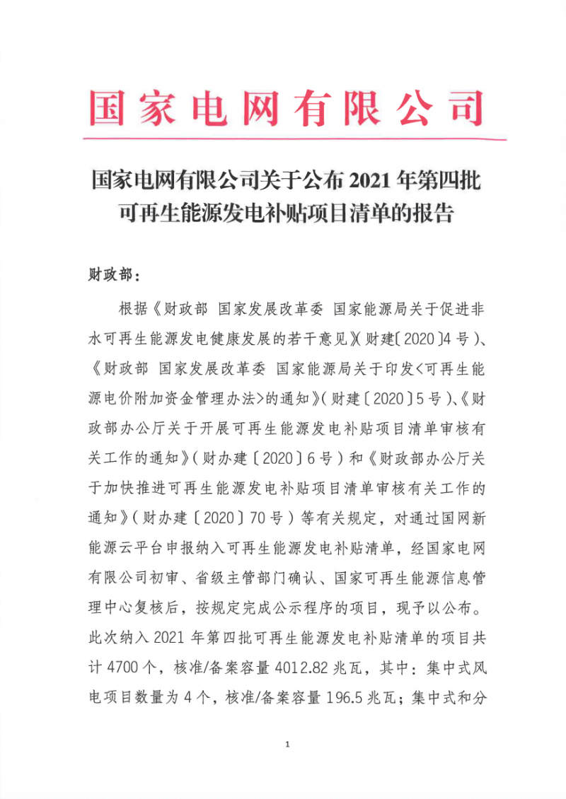 關(guān)于公布2021年第四批可再生能源發(fā)電補貼項目清單的公告