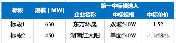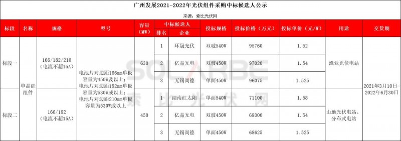 根據(jù)索比光伏網(wǎng)統(tǒng)計(jì),廣州發(fā)展集采標(biāo)段一中標(biāo)候選人第一名為環(huán)晟光伏,投標(biāo)單價(jià)1.52元/W,且為最低投標(biāo)單價(jià),組件投標(biāo)規(guī)格為雙玻540W;標(biāo)段二中標(biāo)候選人第一名為湖南紅太陽(yáng),投標(biāo)單價(jià)1.58元/W,組件投標(biāo)規(guī)格為單面540W。詳情請(qǐng)見(jiàn)下表: