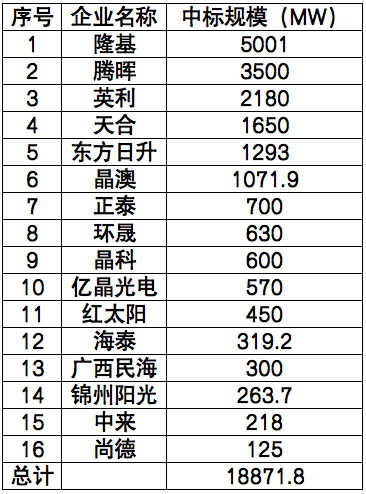 從定標(biāo)情況來看,由于部分央企采取的是框架招標(biāo),實際中標(biāo)人并未明確,在剔除此類招標(biāo)逾10GW后,明確中標(biāo)人的定標(biāo)規(guī)模約為19GW。其中,中標(biāo)規(guī)模TOP5依次為隆基、騰暉、英利、天合、東方日升;在一二線組件企業(yè)占比中,TOP6組件企業(yè)中標(biāo)規(guī)??傆嫗?.616GW,占明確中標(biāo)人總規(guī)模比重為51%。