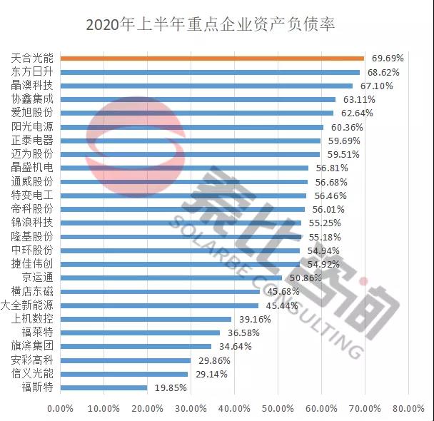 從資產(chǎn)負(fù)債率來看,索比咨詢統(tǒng)計(jì)的98家光伏企業(yè)總負(fù)債9103.98億元,平均負(fù)債率為49.8%,其中電站EPC企業(yè)的負(fù)債率最高,平均達(dá)到61.94%,*ST科林和*ST天龍面臨退市風(fēng)險(xiǎn);上游企業(yè)負(fù)債率為56.15%,輔材企業(yè)負(fù)債率最低,平均負(fù)債率為34.49%。