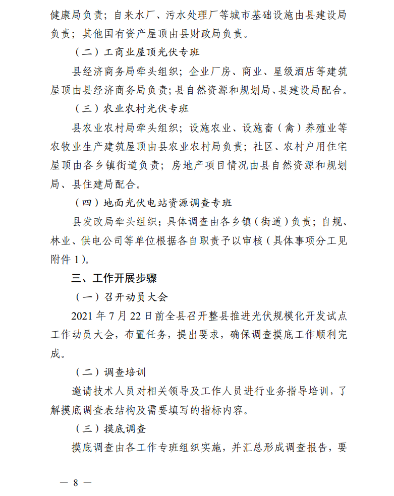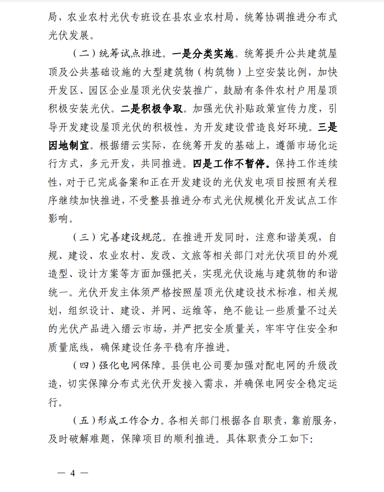 四是工作不暫停。保持工作連續(xù)性,對(duì)于已完成備案和正在開(kāi)發(fā)建設(shè)的光伏發(fā)電項(xiàng)目按照有關(guān)程序繼續(xù)加快推進(jìn),不受整縣推進(jìn)分布式光伏規(guī)?;_(kāi)發(fā)試點(diǎn)工作影響。