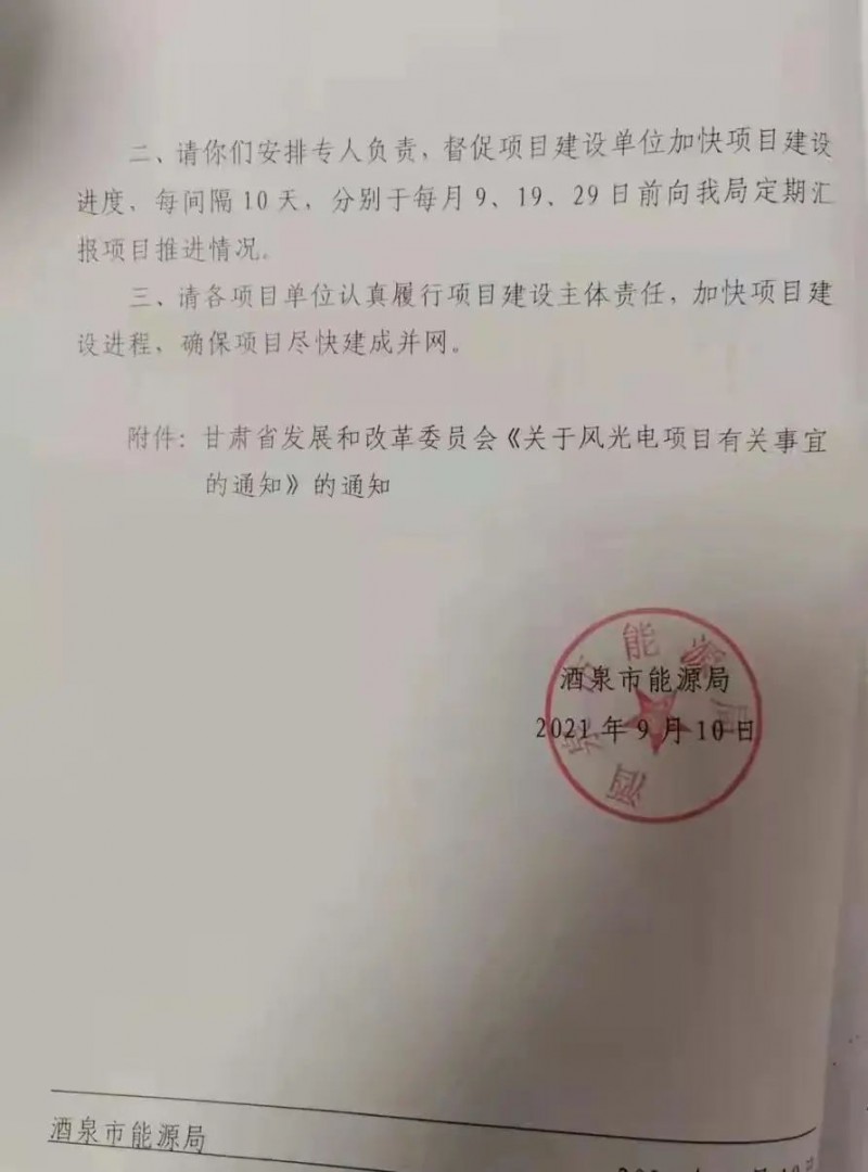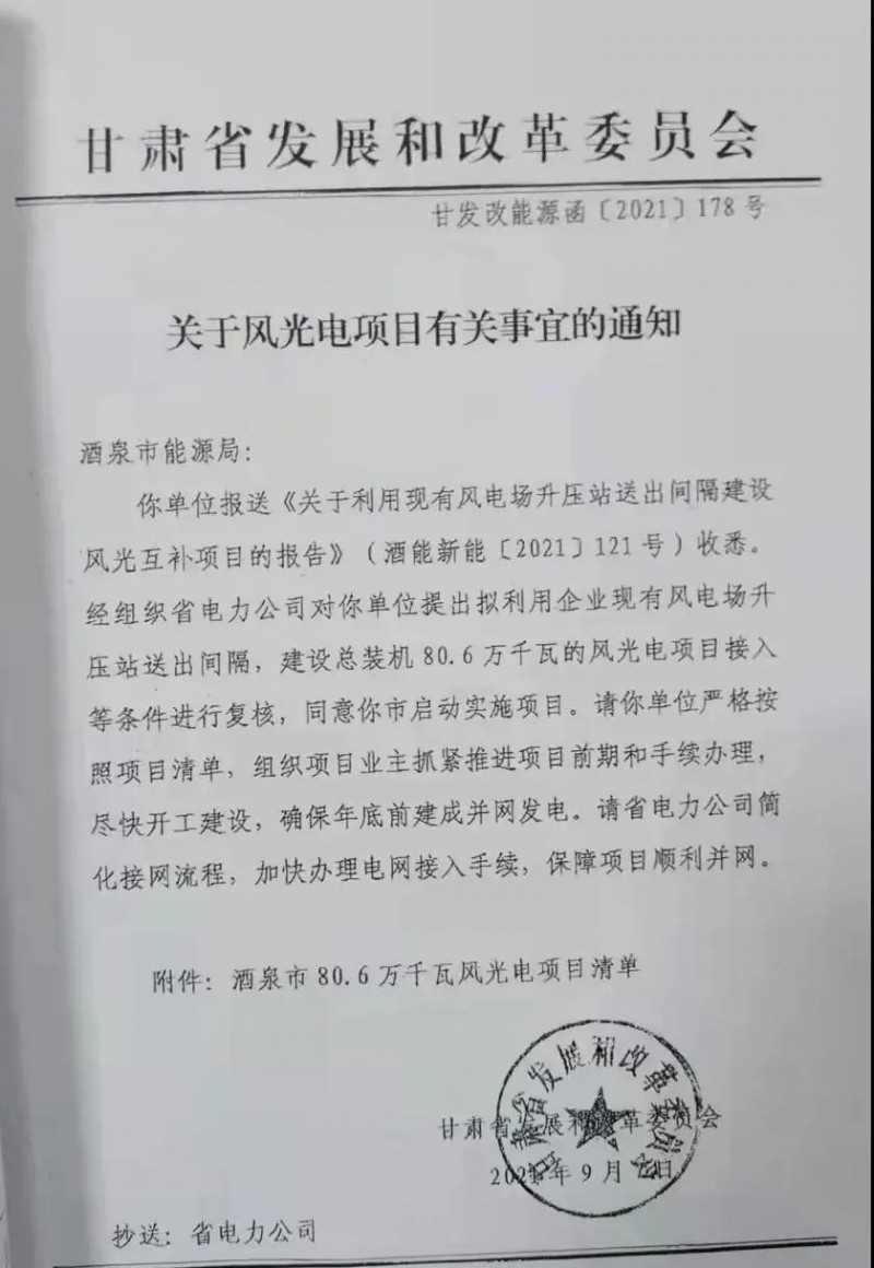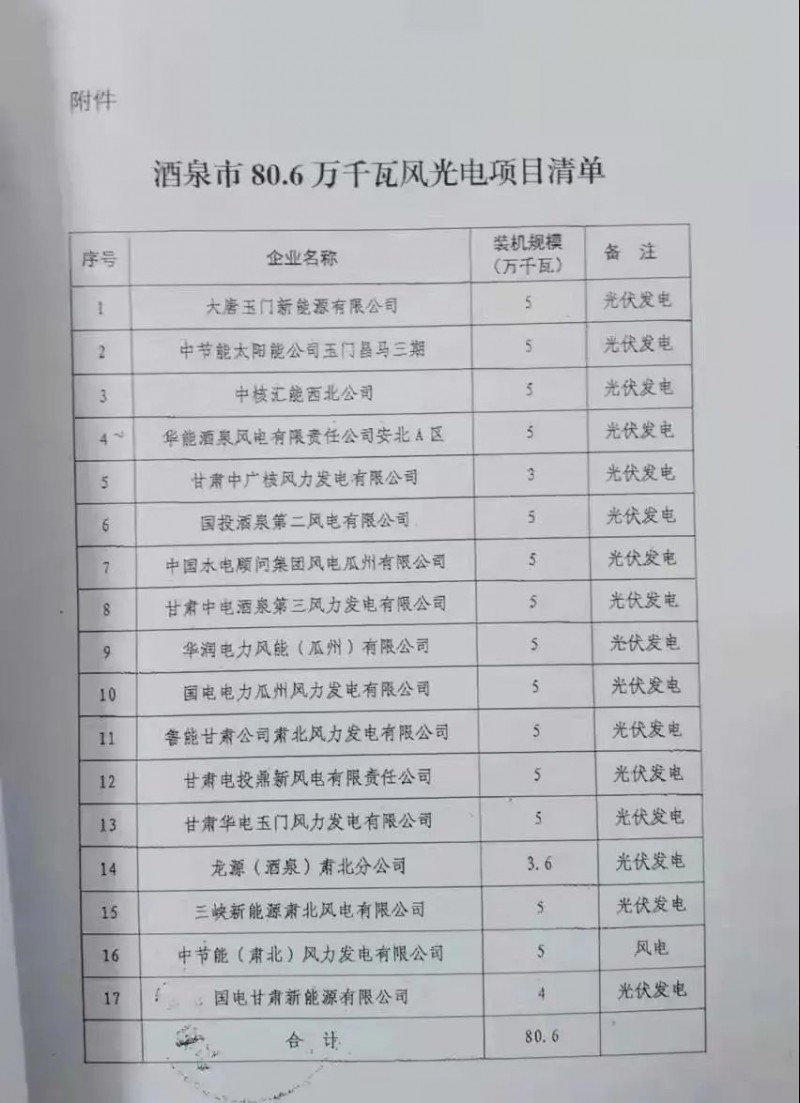 酒泉市2021年風(fēng)、光建設(shè)規(guī)模為806MW,其中光伏756MW,風(fēng)電50MW;