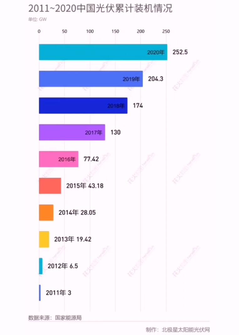 從2011年至2020年,中國光伏累計(jì)裝機(jī)從3GW增長至252.5GW,根據(jù)國家能源局?jǐn)?shù)據(jù),截至2021年6月30日,中國光伏累計(jì)裝機(jī)已達(dá)267GW,十年飆漲880%。