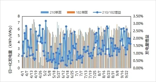 綜合2021年4月~9月數(shù)據(jù),210單面組件單瓦發(fā)電量較182單面組件高1.2%。
