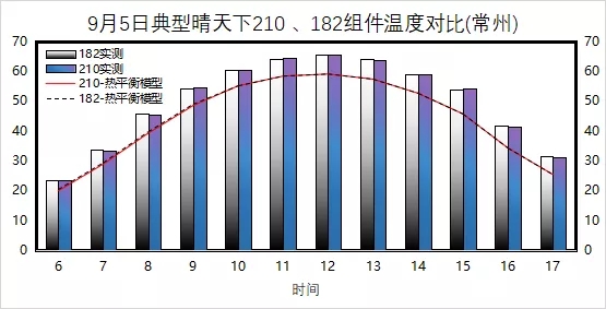 為探究組件真實(shí)戶外工作溫度,使用HIOKI熱電偶數(shù)據(jù)采集儀對(duì)組件進(jìn)行工作溫度采集。實(shí)證結(jié)果顯示,210與對(duì)比測(cè)試樣件溫度幾乎無差異,根據(jù)輻照加權(quán)平均溫度,210組件甚至略低于對(duì)比組件0.5℃。使用PVsyst仿真,組件相同溫度系數(shù)的情況下,在常州,工作溫度每降低1℃,發(fā)電量提升約為0.2%。同時(shí),選取9月5日典型天氣,將實(shí)測(cè)數(shù)據(jù)及實(shí)測(cè)氣象數(shù)據(jù)代入穩(wěn)態(tài)熱平衡模型,更證明了高電流、低開壓的210組件無明顯溫升,且在早晚輻照及溫度較低時(shí),210組件組件工作溫度較低。