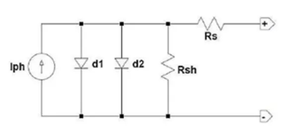 為研究210低輻照性能優(yōu)勢(shì),本文以雙二極管模型對(duì)測(cè)試樣件進(jìn)行建模分析;二極管模型表征電池及組件特性被廣泛使用,例如PVsyst中的PAN file; 在傳統(tǒng)的單二極管模型上,雙二極管模型額外考慮了耗盡區(qū)的復(fù)合損耗,可以有效驗(yàn)證低輻照下組件性能:
