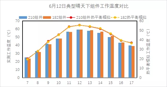 任選典型晴天下,組件工作溫度實(shí)測(cè)與模擬結(jié)果均顯示,210組件并無高工作溫度風(fēng)險(xiǎn),且早晚低輻照時(shí)段,210組件溫度略有優(yōu)勢(shì):