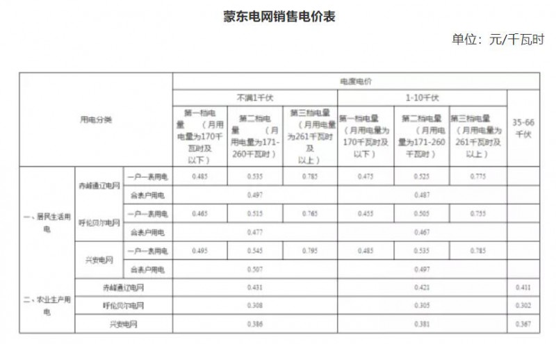 注:1.上表所列價格,均含國家重大水利工程建設基金0.1125分錢。2.上表所列價格,除農業(yè)生產用電外,均含大中型水庫移民后期扶持資金0.23分錢、可再生能源電價附加0.1分錢。3.對城鄉(xiāng)“低保戶”和農村牧區(qū)“五保戶”家庭每戶每月設置15度免費用電基數(shù),分別按照表中居民生活用電第一檔電量電價標準收取及返還。4.對執(zhí)行居民生活用電、農業(yè)生產用電的電壓等級在35-110千伏及以上的用戶,按表中1-10千伏所對應的電度電價標準執(zhí)行。