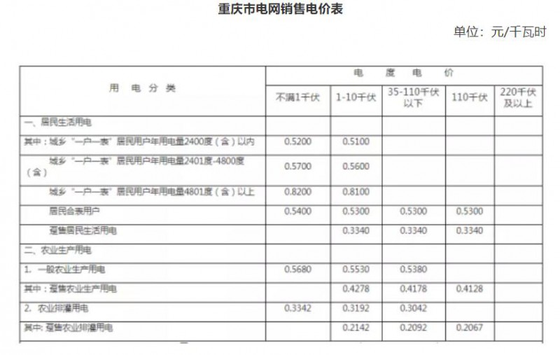 注:1. 上表所列價格,均含國家重大水利工程建設基金0.196875分錢;除農業(yè)排灌用電外(農業(yè)排灌用電基金征收按原政策口徑執(zhí)行),均含農網(wǎng)還貸資金2分錢;除農業(yè)生產用電外,均含大中型水庫移民后期扶持基金0.6225分錢、地方水庫移民后期扶持基金0.05分錢、可再生能源電價附加0.1分錢。2.已摘帽國家級貧困縣農業(yè)排灌用電按表列分類電價降低0.196875分錢(國家重大水利工程建設基金)執(zhí)行。3.國網(wǎng)重慶市電力公司對其控股供電公司躉售電量不適用此表所列躉售價格。