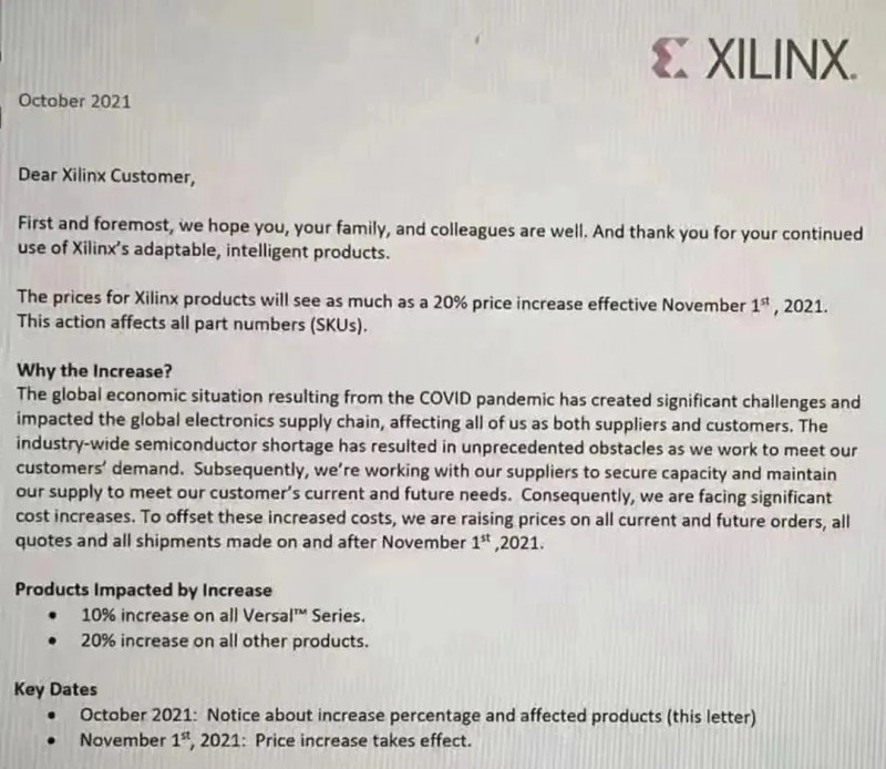 9月底,多家主要海外芯片生產(chǎn)商紛紛宣布,對(duì)IGBT和IC半導(dǎo)體等核心芯片展開新一輪漲價(jià)。意法半導(dǎo)體表示,將在今年最后一個(gè)季度提高所有產(chǎn)品價(jià)格,包括現(xiàn)有庫(kù)存;安森美則是從10月初開始,對(duì)部分產(chǎn)品漲價(jià)生效,新價(jià)格將適用于新訂單和現(xiàn)有積壓訂單;此外,賽靈思也發(fā)布通知稱,將會(huì)提高2021年11月1日及之后所有當(dāng)前和未來的訂單、所有報(bào)價(jià)和所有發(fā)貨的價(jià)格。