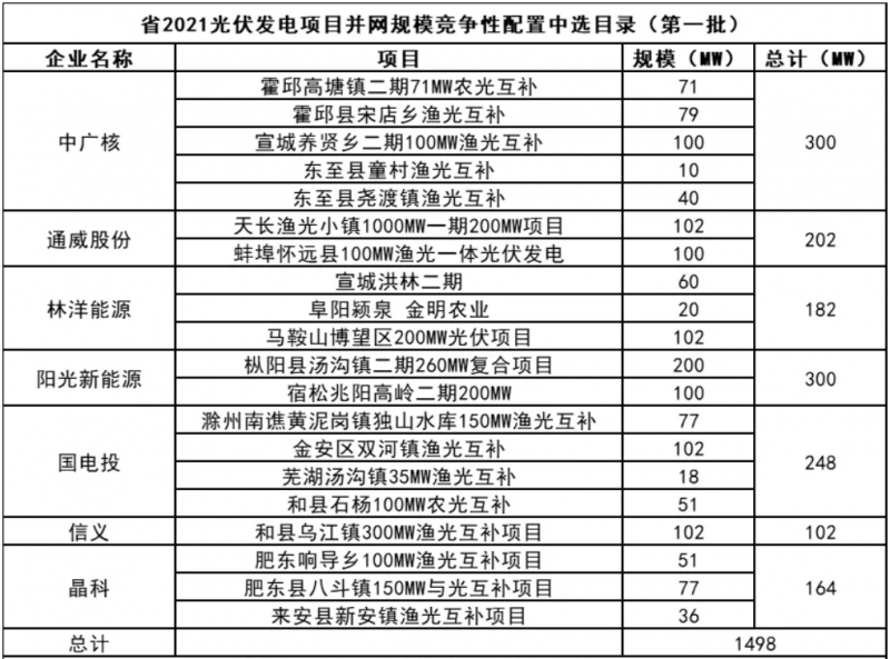 此前10月21日,安徽省能源局下發(fā)《2021年光伏發(fā)電項(xiàng)目并網(wǎng)規(guī)模競(jìng)爭(zhēng)性配置(第一批次)中選公告》,規(guī)模共計(jì)1498MW。中廣核、陽(yáng)光新能源、國(guó)家電投、通威、林洋、晶科、信義光能等7家企業(yè)中標(biāo)20個(gè)光伏第一批優(yōu)選項(xiàng)目。加上此次安徽省總共公示了4GW光伏、1.166GW風(fēng)電項(xiàng)目。