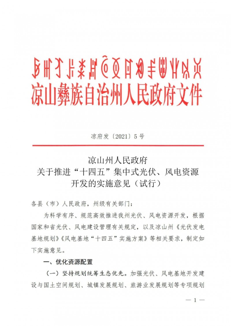 近日,涼山州人民政府發(fā)布《關(guān)于推進(jìn)“十四五”集中式光伏、 風(fēng)電資源開發(fā)的實(shí)施意見(試行)》,意見提出:
