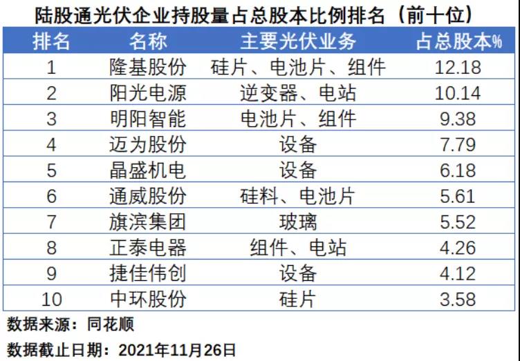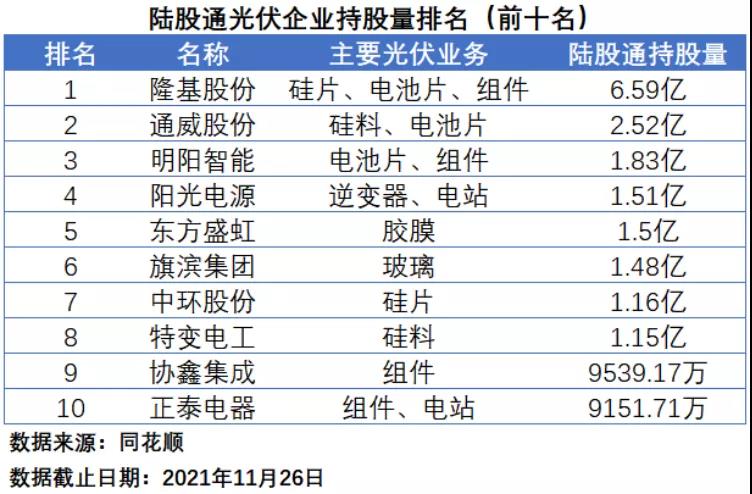 在陸股通持股量排名中,截止到11月26日收盤(pán)(下同),隆基股份憑借自身超強(qiáng)的綜合實(shí)力以及較高的總股本規(guī)模最受“北向資金”的青睞,以6.59億的持股量位居第一,通威股份和明陽(yáng)智能分別以2.52億和1.83億位居第二和第三。陽(yáng)光電源、東方盛虹、旗濱集團(tuán)、中環(huán)股份、特變電工的持股量均在1億股以上。在前十名中,共有4家企業(yè)涉足組件業(yè)務(wù),3家企業(yè)涉足電池片業(yè)務(wù),涉足硅料、硅片業(yè)務(wù)的企業(yè)各有2家。